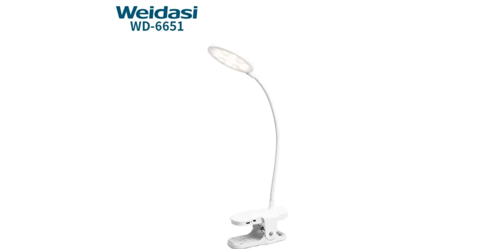 این چراغ مطالعه گیره ای جدید کمپانی ویداسی (WEDASI) به راحتی به میز کار، کتابخانه و یا هر سطح دیگری متصل می‌شود. بدنه‌ی انعطاف‌پذیر آن قابلیت خم شدن به زاویه‌های مختلف را دارد. لامپ SMD (20 عدد) با نوردهی مناسب، مصرف کم و عمر طولانی، روشنایی دلپذیری را ارائه می‌دهد. یک باتری قابل شارژ در پایه چراغ تعبیه شده است که استفاده از آن را مستقل از برق شهری می کند و در مواقع قطعی برق به شما امکان ادامه کار و مطالعه را می‌دهد. با استفاده از دکمه‌ی لمسی، می‌توانید شدت نور را تنظیم کنید. لمس اولیه، نور زرد ضعیف را فعال می‌کند و لمس مجدد، نور را افزایش می‌دهد.