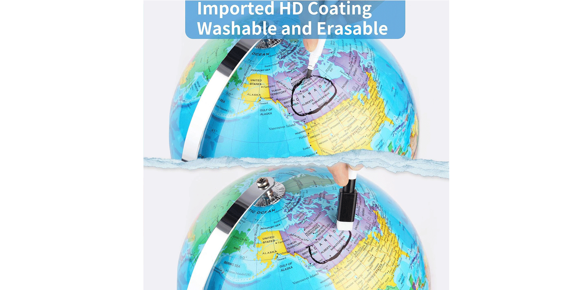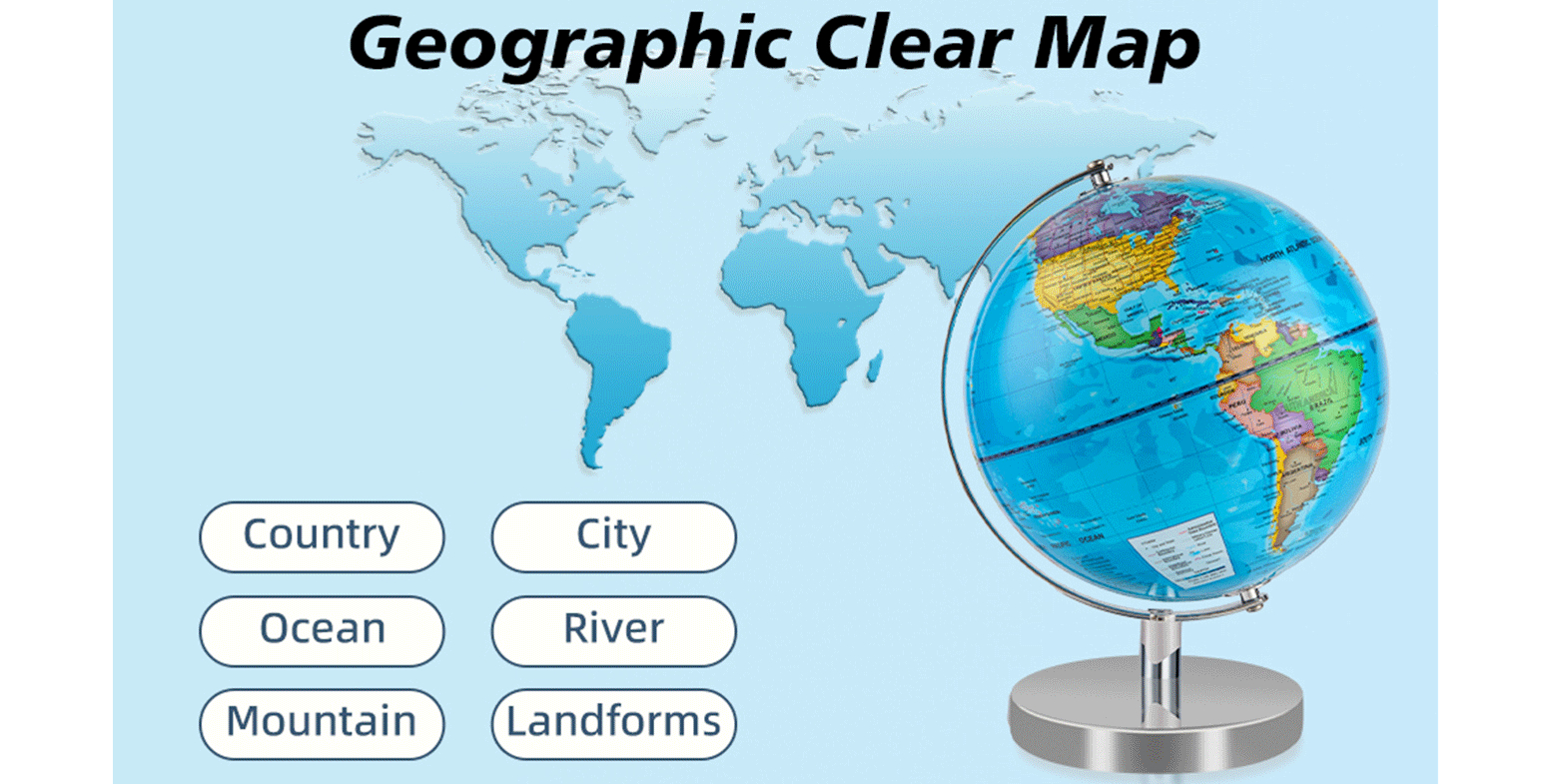 دارای پایه از جنس استیل درجه یک و چاپ متالیک و وکیومی که کره زمین دارد یک جلوه ای خاص می دهد  روی یک پایه کوچک استیل به صورت 360 درجه قرار می گیرد و روی آن می چرخد . کره جغرافیایی انگلیسی سایز ۱۴ با پایه استیل مقاوم؛ مناسب برای دکوراسیون مدرن و استفاده آموزشی